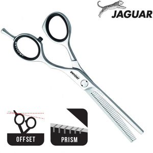 "The Jaguar Silver Line CJ 40 Plus Left-Handed Offset Hair Thinning Scissors are a game-changer for left-handed stylists. Their 40 prism-shaped teeth provide exceptional control for creating seamless blends and reducing bulk. These scissors excel in point cutting and slide cutting for texturizing, offering clean, precise results. The ergonomic offset design significantly reduces hand fatigue, making them ideal for long styling sessions."