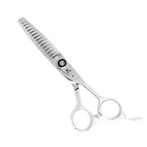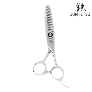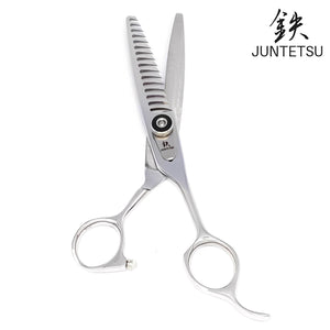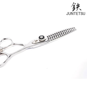 "Juntetsu VG10 Chomper 21-Teeth Texturizing Scissors excel in texturizing and thinning, thanks to its 21 V-shaped teeth. It's also effective for point cutting. These versatile scissors adapt well to various cutting methods, making them a valuable tool for professionals."