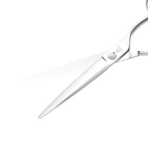 "Juntetsu's Premium Series Cobalt Sword Scissors redefine precision and slide cutting. Their distinctive sword blade excels at blunt cuts, while the 3D offset grip boosts control for point cutting and scissor-over-comb work. These adaptable shears seamlessly handle various cutting styles, making them indispensable for exacting stylists who demand top-tier performance and ergonomic comfort."