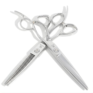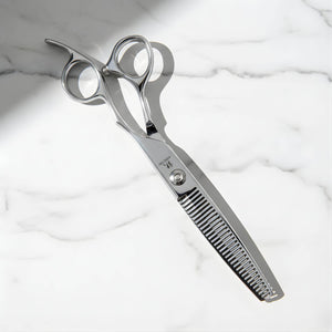 "Juntetsu VG10 Offset Master Scissor Set excels in precision cutting and texturizing, thanks to its comprehensive range of cutting and thinning scissors. The cutting scissors are particularly effective for slide cutting and blunt cutting, while the thinning scissors excel in texturizing. The offset handle enhances comfort during scissor-over-comb techniques. This versatile set adapts well to various cutting methods, making it an indispensable toolkit for professional stylists."