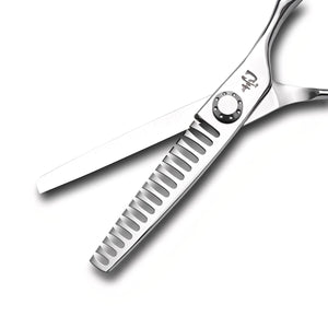 "Ichiro Premium Series: Taiyo VG10 Cutting & Texturizing Scissor Set excels in precision cutting and texturizing. The ultra-sharp convex edge is particularly effective for slide cutting, while the 15 texturizing teeth offer superior point cutting capabilities. These versatile scissors adapt well to various cutting methods, making them indispensable for achieving modern styles in professional settings."