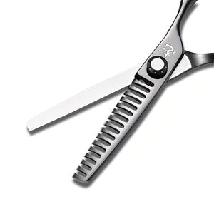 "Ichiro Premium Series: Tsuki VG10 Black Texturizing Scissors excel in creating texture and volume with precision. The 15 texturizing teeth are particularly effective for chunking and thinning techniques. These versatile scissors also perform admirably in point cutting, adapting well to various texturizing methods. Their ergonomic design and unique black finish make them comfortable for extended use and visually striking, making them indispensable for achieving modern, textured styles in professional settings."