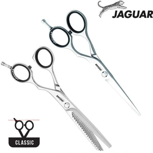 The Jaguar Gold Line Diamond Scissors Set combines premium professional hair cutting tools crafted by Jaguar Germany, known for creating the best hairdressing and barber scissors. This set includes the Jaguar Gold Line Diamond E Classic Hair Cutting Scissors and the Jaguar Gold Line Diamond 28 Classic Hair Thinning Scissors, providing a complete solution for professional stylists.