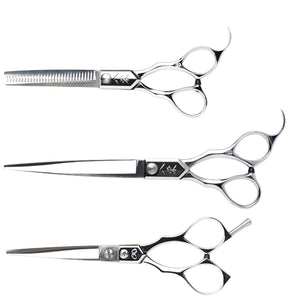 This set includes 2 pairs of Yasaka Barber Cutting Scissors of your choice and a pair of Thinning Scissors.
