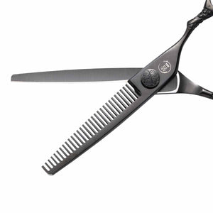 "The Mina Ash Black Thinning Scissors are unparalleled for creating seamless blends and removing bulk efficiently. Their precise V-teeth serration makes them ideal for all thinning techniques, essential for professionals working with diverse hair types."